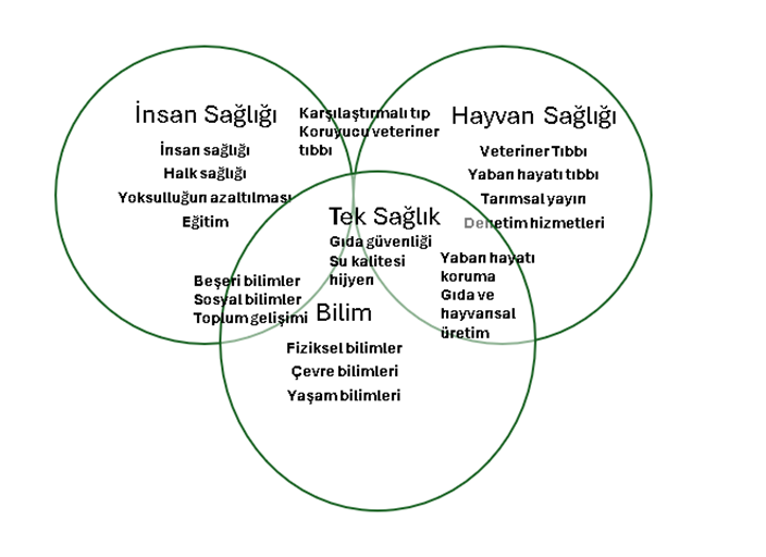 Şekil 1'de insan, hayvan ve ekosistem sağlığını herkesin yararına geliştirmek için disiplinlerarası bilimsel araştırmalarda doktorların, veteriner hekimlerin ve bilim insanlarının rolünü ayrıntılı olarak açıklamaktadır. Bu çerçeve, temiz su, hijyenik gıda ve hijyenik yaşam koşulları olmadan halk sağlığının iyileşemeyeceğini ortaya koymaktadır.